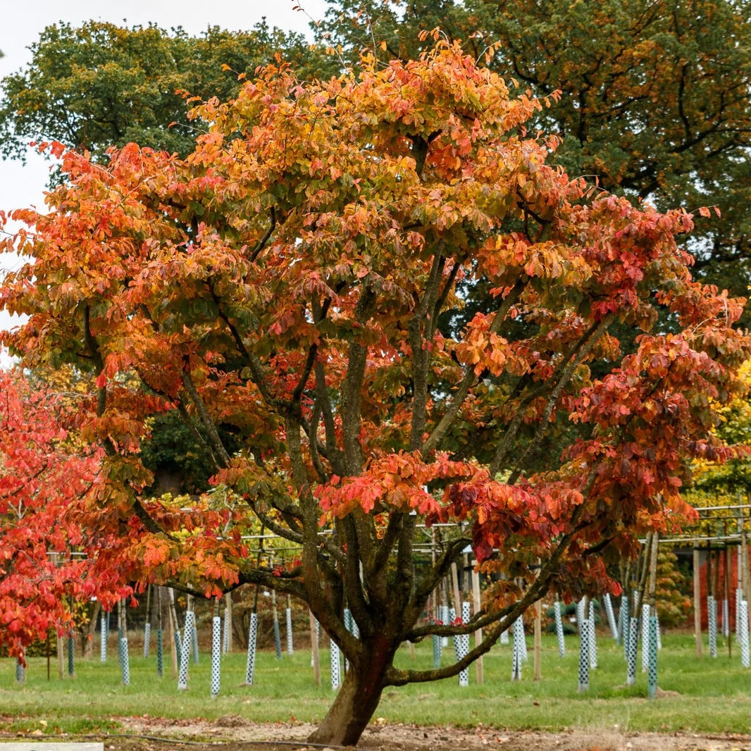 Lombhullató fa, melynek őszi levélszíneződése nagyon látványos. Közepes termetű, alacsonyan elágazó, áltálában többtörzsű fa. Szórt állású levelei hullámos szélűek, az ősz folyamán tűzpirosra, bordóra vagy sárgára színeződnek. Napos fekvést kedveli, talajban nem válogatós.